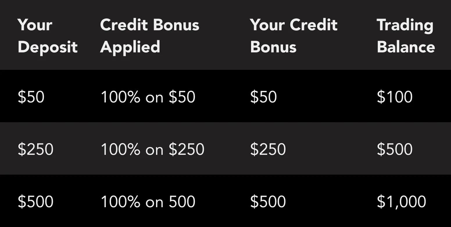 5.Eligible Clients who meet the criteria set forth herein are able to receive credit bonuses or otherwise known as trading credit, equal to: