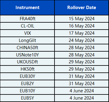 Please be advised that the following CFD instruments will be automatically rolled over as per the dates in the table below. As there can be a pricing difference between old and new futures contracts, we recommend clients to monitor their positions closely and manage positions accordingly.